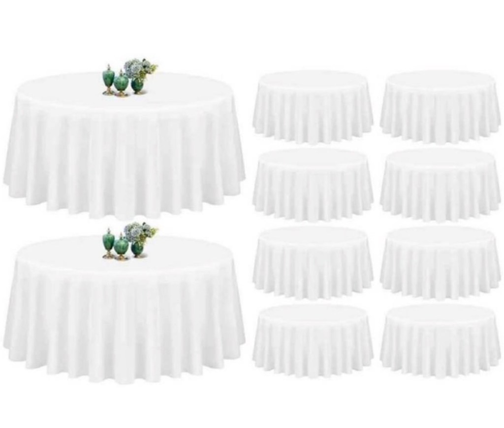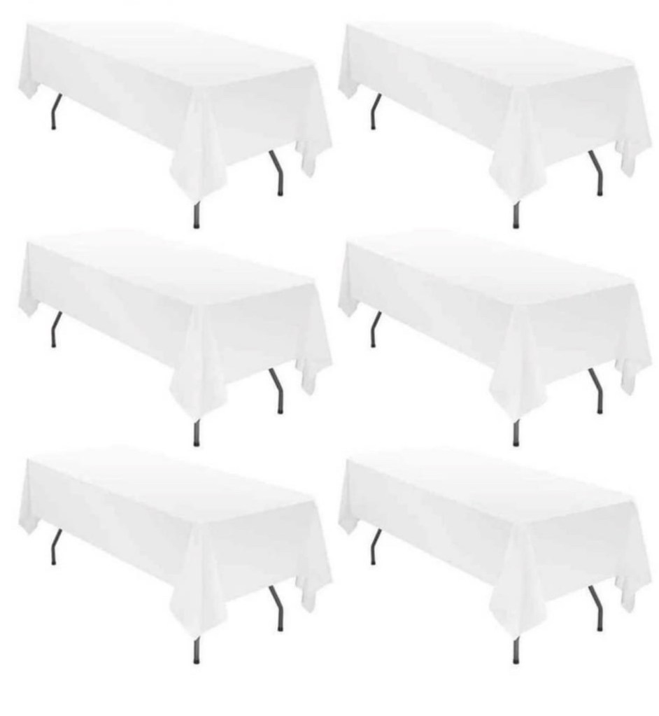 Tablecloths: White or Ivory Rectangle 60×120 $9, 90×132 $15 Round 90” $9 108” $15