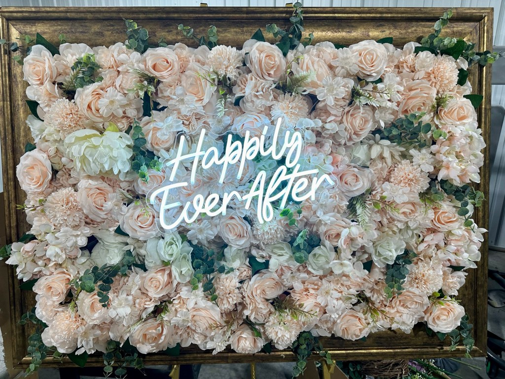Framed Florals on an easel $ 55 with a neon sign $75